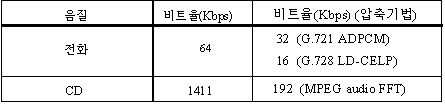 ¿Àµð¿ÀÀÇ °æ¿ì µÎ °¡Áö ·¹º§ÀÇ À½ÁúÀÌ ÀÖ´Ù. ÀüÈ À½ÁúÀº 64 KbpsÀÇ ºñÆ®À²À» ¿ä±¸Çϴµ¥ ¾Æ³¯·Î±× ½ÅÈ£´Â ÃÊ´ç 8,000¹øÀÇ »ùÇøµ(sampling) Áï Ç¥º»È°¡ ÀϾ°í °¢ »ùÇÃÀº 8ºñÆ®·Î ÀÎÄÚµùµÇ¹Ç·Î 64 Kbps¶ó´Â ¼öÄ¡°¡ ³ª¿Â´Ù. ¾ÐÃàÀÌ »ç¿ëµÉ ¶§´Â 32, 16 ¶Ç´Â 4 KbpsÀÇ ºñÆ®À²·Îµµ ÀüÈ À½ÁúÀ» ³¾ ¼ö ÀÖ´Ù. CD ¿Àµð¿À´Â ¾Æ³¯·Î±× ½ÅÈ£¸¦ 44.1 KHz(ÃÊ´ç 44,100¹ø), 16ºñÆ® »ùÇøµÀ» Çϰí, ½ºÅ×·¹¿À »ç¿îµåÀ̹ǷΠ44.1 * 103 * 16 * 2 = 1,411.2 Kbps ¾à 1.4 MbpsÀÇ ºñÆ®À²À» ¿ä±¸Çϸç MPEGÀÇ ÇÑ °èÃþÀÎ MUSICAM ±â¹ýÀ¸·Î ¾ÐÃàµÉ °æ¿ì 192 KbpsÀÇ ºñÆ®À²À̸é CD À½ÁúÀ» ³¾ ¼ö ÀÖ´Ù.