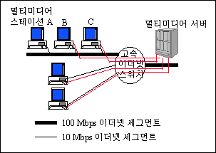 ¾Æ·¡ ±×¸²¿¡ 100 Mbps ÀÌ´õ³ÝÀÌ ¸ÖƼ¹Ìµð¾î ÀÀ¿ë¿¡ »ç¿ëµÇ´Â ÇüŸ¦ º¸À̰í ÀÖ´Ù. ¸ÖƼ¹Ìµð¾î ¼¹ö´Â 100 Mbps·Î ¿¬°áµÇ¾î ÀÖ°í ½ºÅ×À̼ÇÀº 100 ¶Ç´Â 10 Mbps·Î ¿¬°áµÉ ¼ö ÀÖ´Ù.